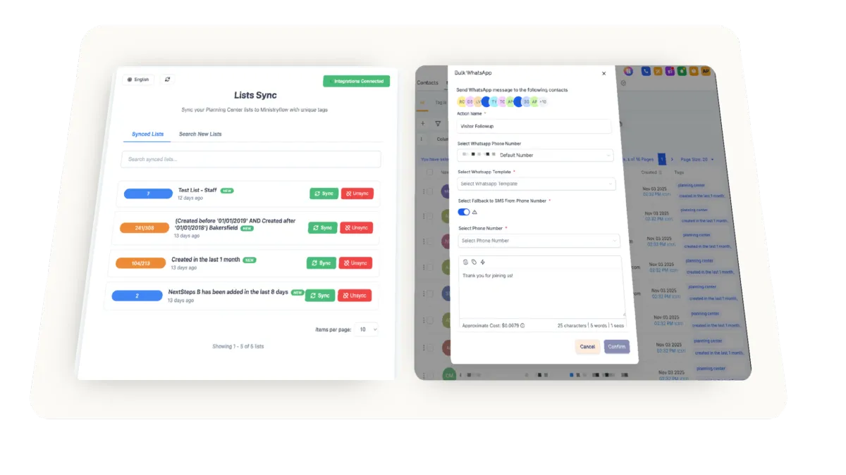 2-way SMS & Email campaigns. Sync contacts from Planning Center